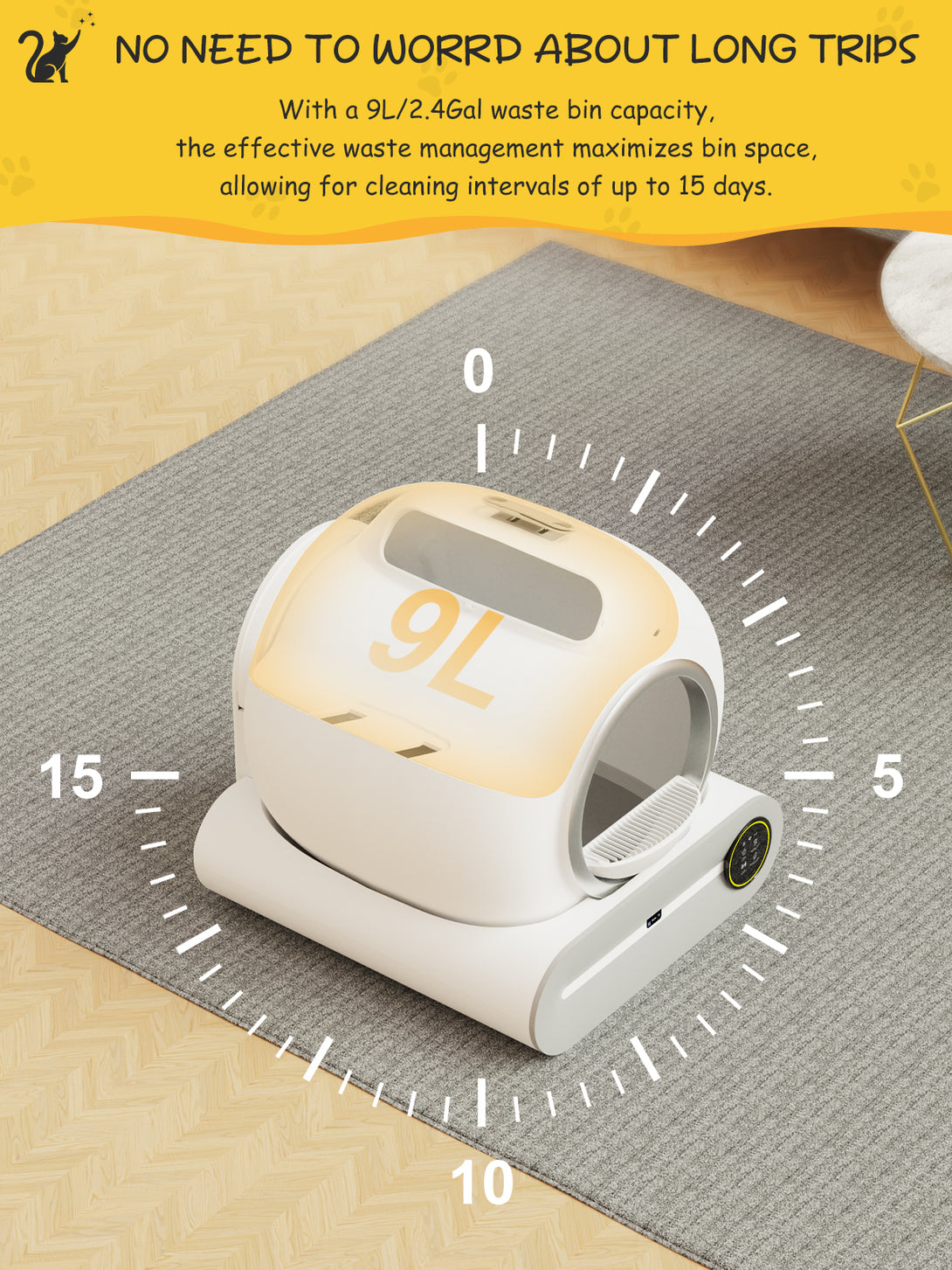 · Compact Size, Ample Space: Designed with a compact footprint of 18.9 inches x 20.5 inches x 19.9 inches, our automatic cat litter box fits seamlessly into any living space. Despite its small size, it boasts a spacious collection chamber with a capacity of 9L, ensuring that your cat has plenty of room to move around. This generous capacity means you won't have to worry about emptying the litter box frequently, even if you're away for up to 15 days.
