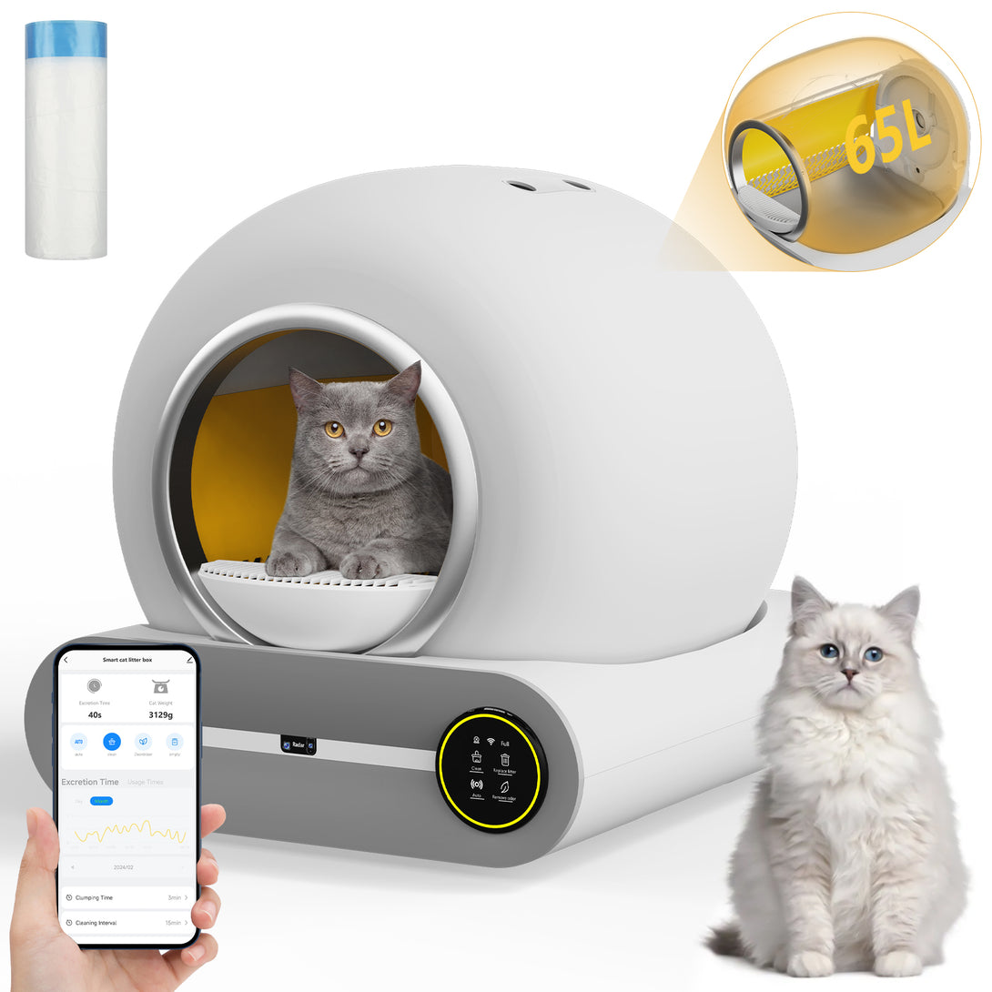Smart Self-Cleaning Litter Box - 65L+9L Capacity, App Control, and Mess-Free Design for Multiple Cats, White