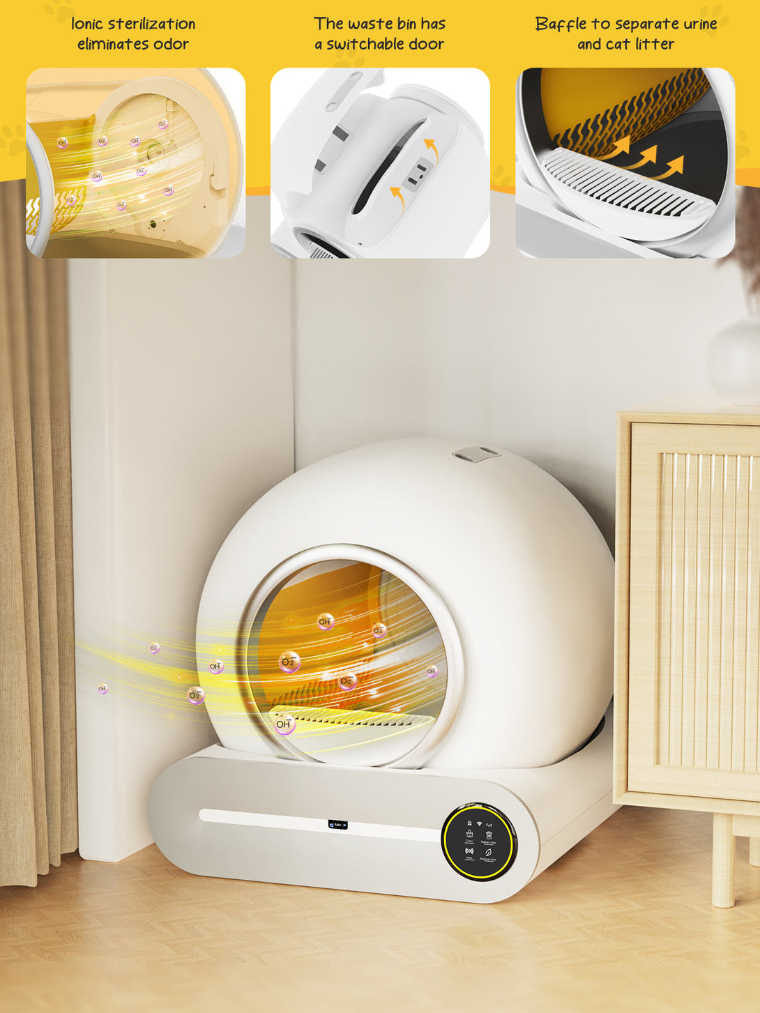 · Advanced Cleaning System: Our state-of-the-art litter box incorporates an intelligent cleaning system that effectively eliminates odors and keeps trash at bay, creating a clean and sanitary environment for your cat. The integrated data monitoring feature allows you to track the usage patterns of multiple cats. With a self-rotating collection chamber, maintaining a tidy litter box is effortless, while the spacious design offers your cat ample room to comfortably do their business. Furthermore, our litter box operates quietly, ensuring minimal noise disruption.