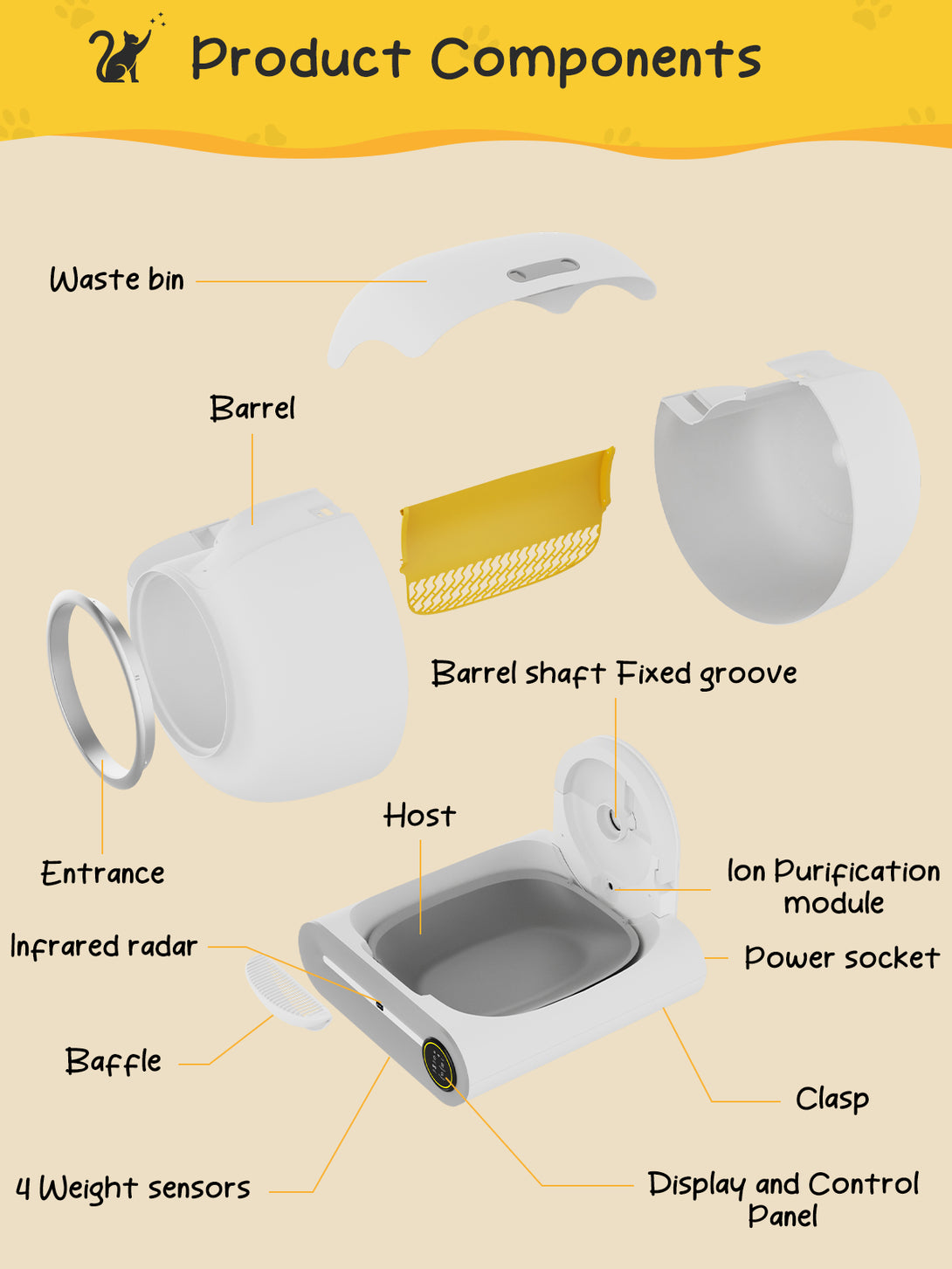 · Motion-Sensing Technology for Enhanced Safety: The bottom of our automatic cat litter box is equipped with four gravity sensors. These sensors ensure the safety of your cat by automatically stopping the rotation of the device when your cat approaches the litter box. Additionally, the front infrared sensor detects your cat's presence, further enhancing the safety and convenience of the litter box. With this advanced motion-sensing technology, you can have peace of mind knowing that your cat's well-being is a top